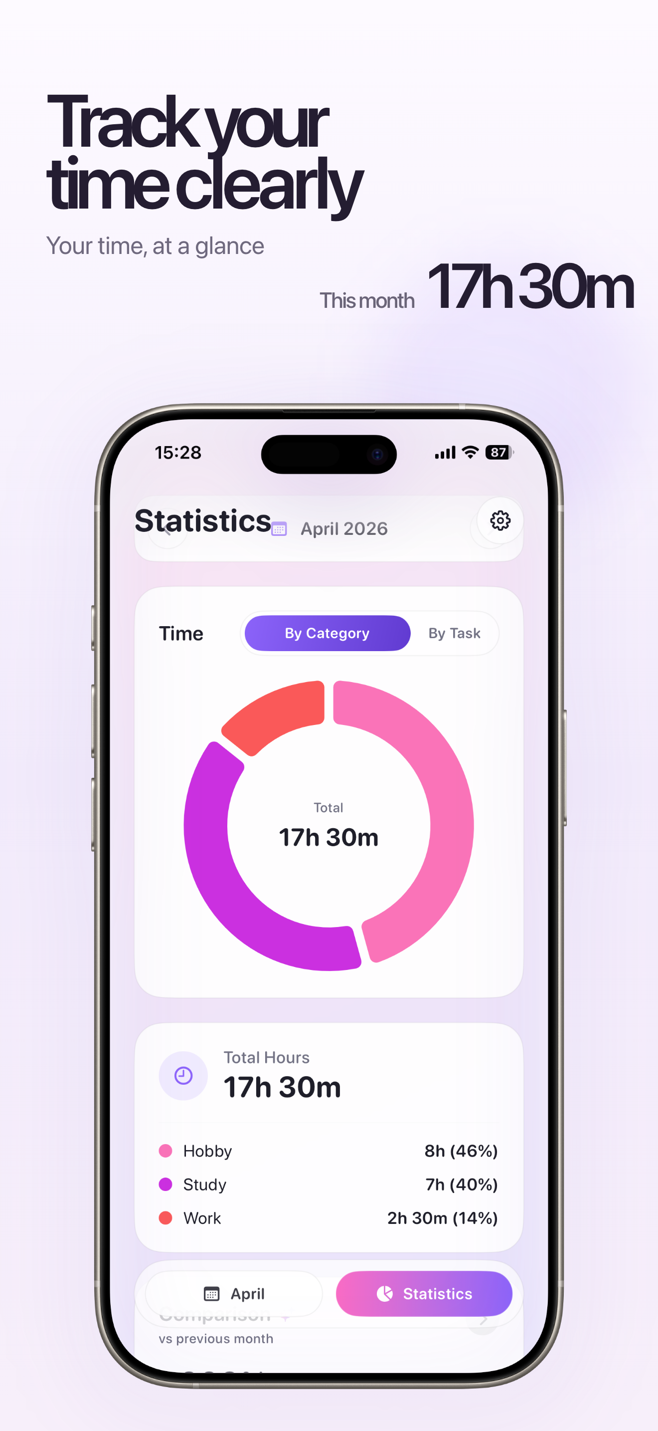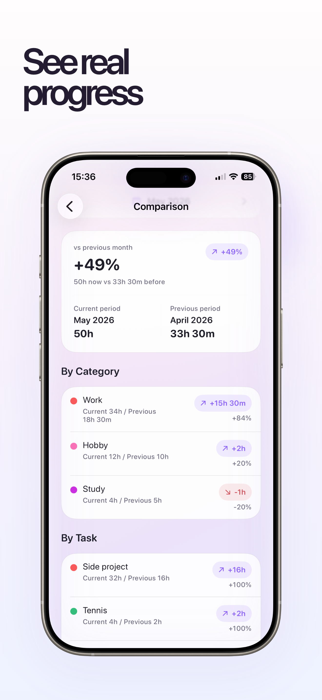 See your time by category or task, compare periods, and understand patterns without clutter.